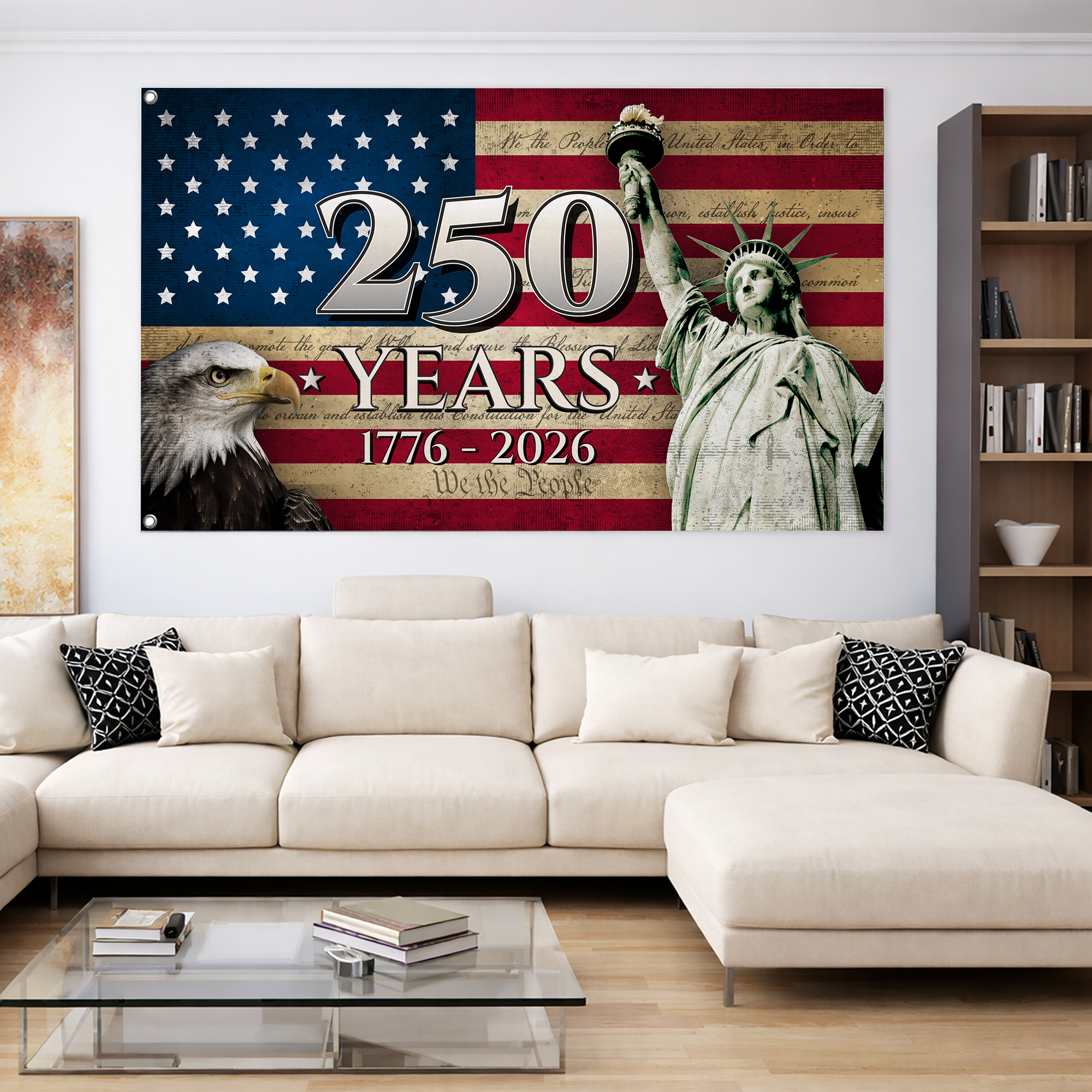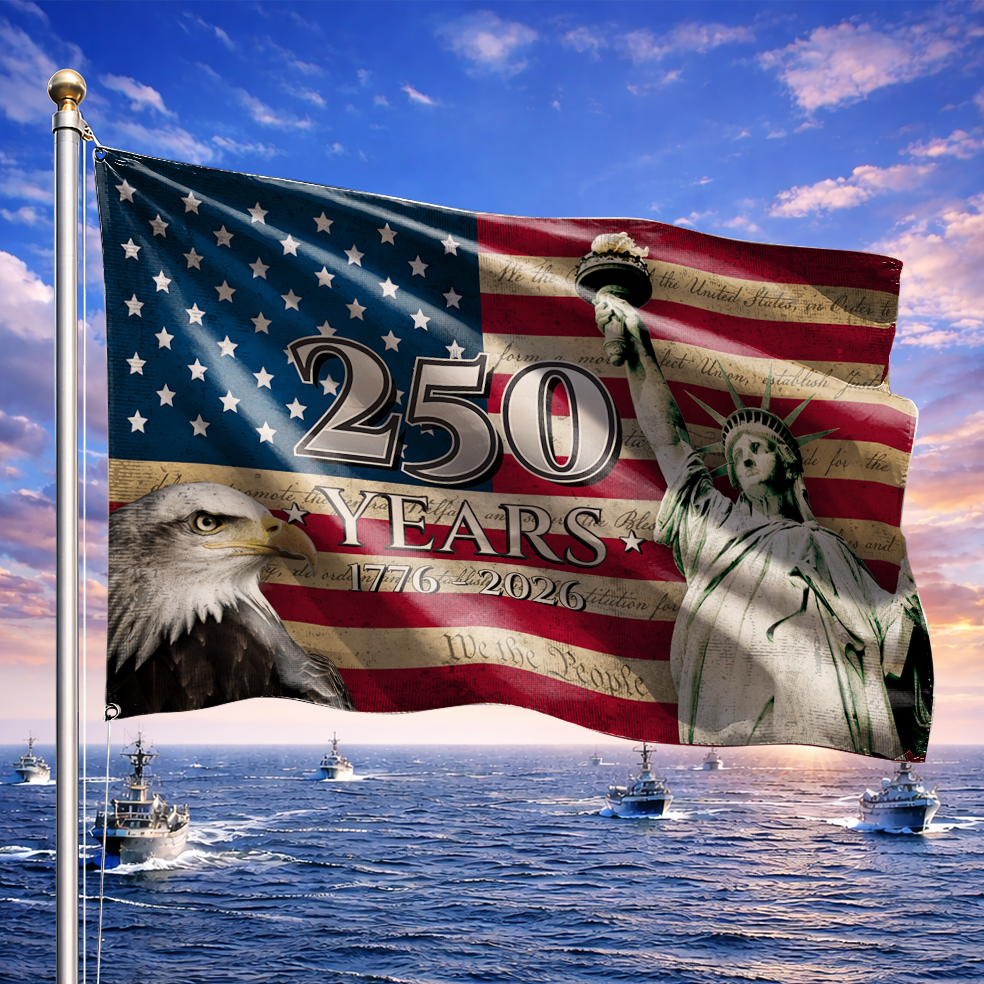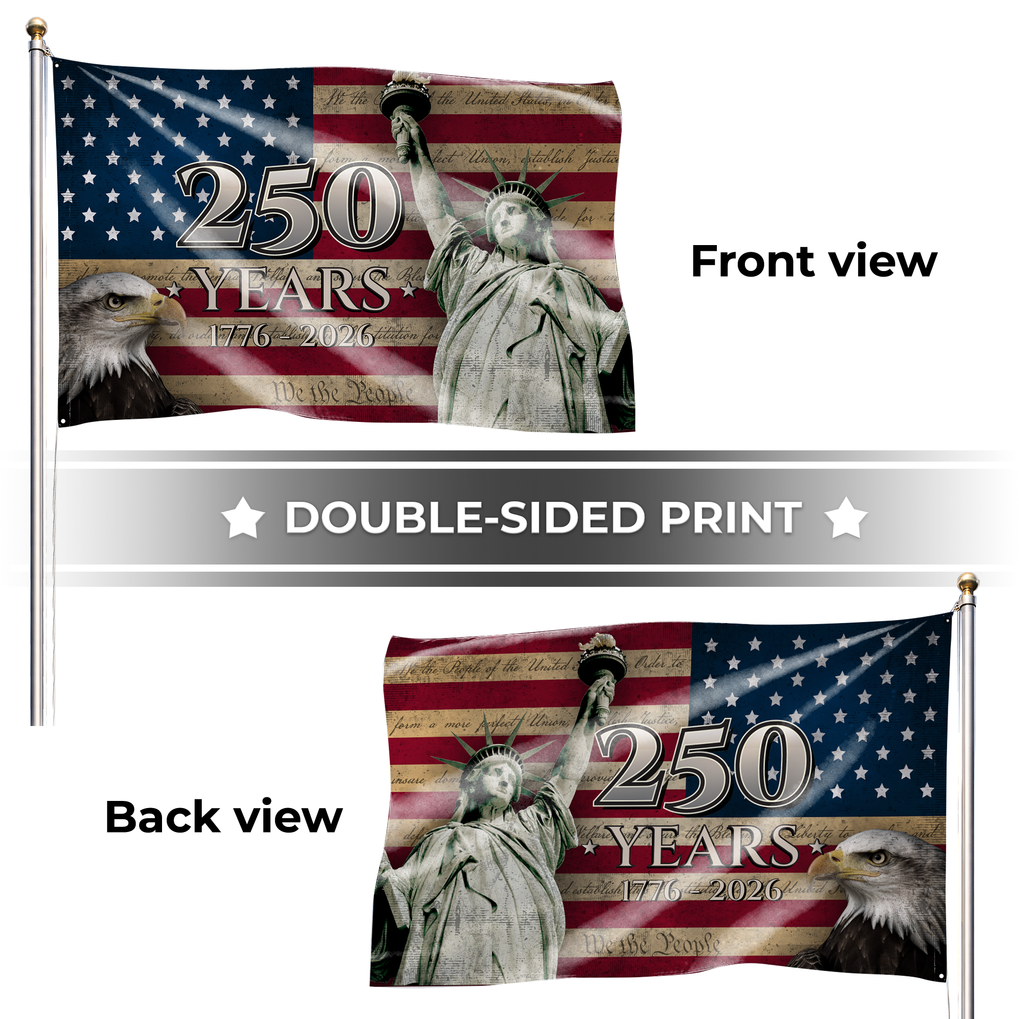 Honor a monumental milestone with our exclusive "America 250 Years" patriotic flag. Featuring a powerful bald eagle, the iconic Statue of Liberty, and the historic text of the USA constitution, this striking design is the ultimate tribute to American pride, liberty, and freedom. The bold "250 YEARS 1776 - 2026" text proudly commemorates the nation's remarkable journey.