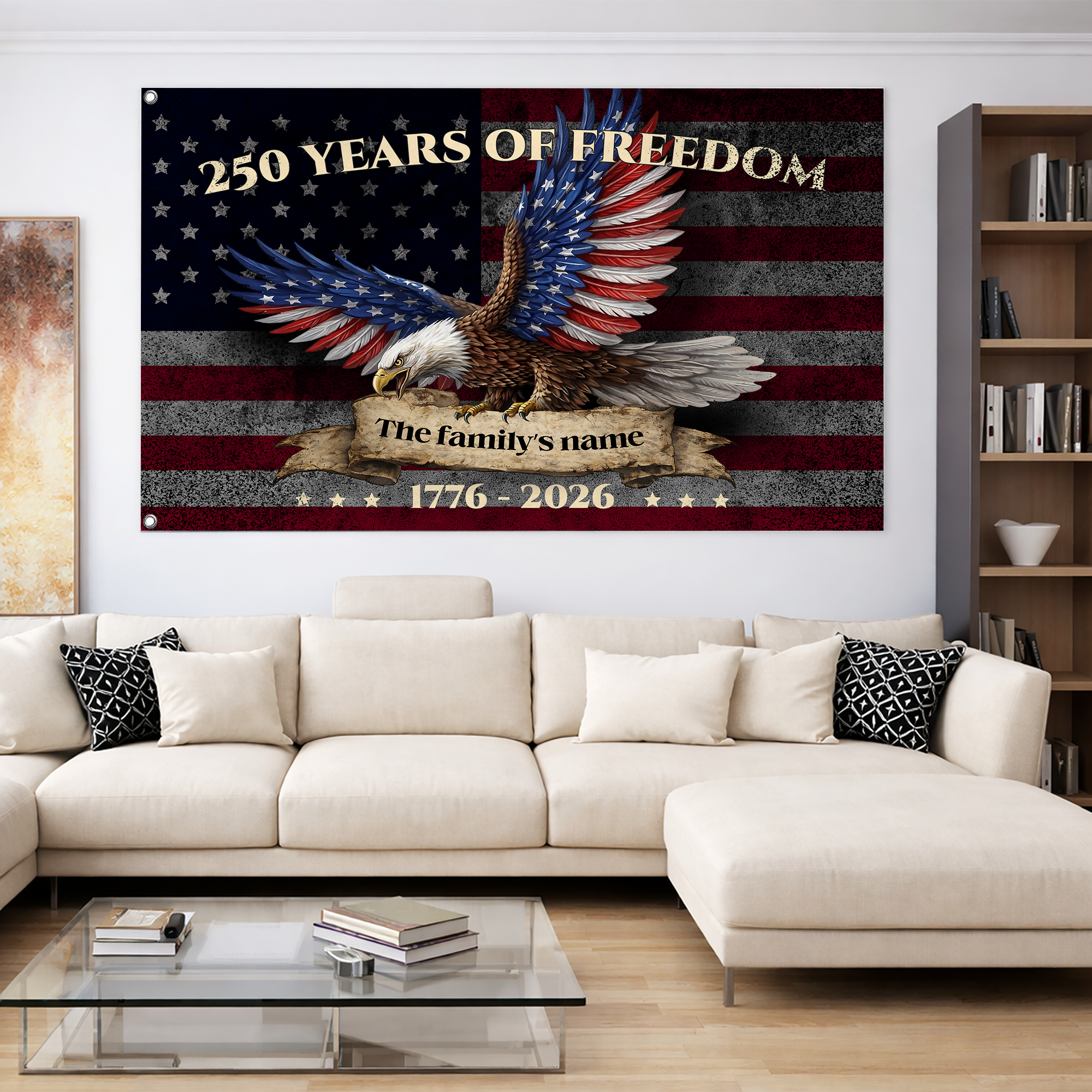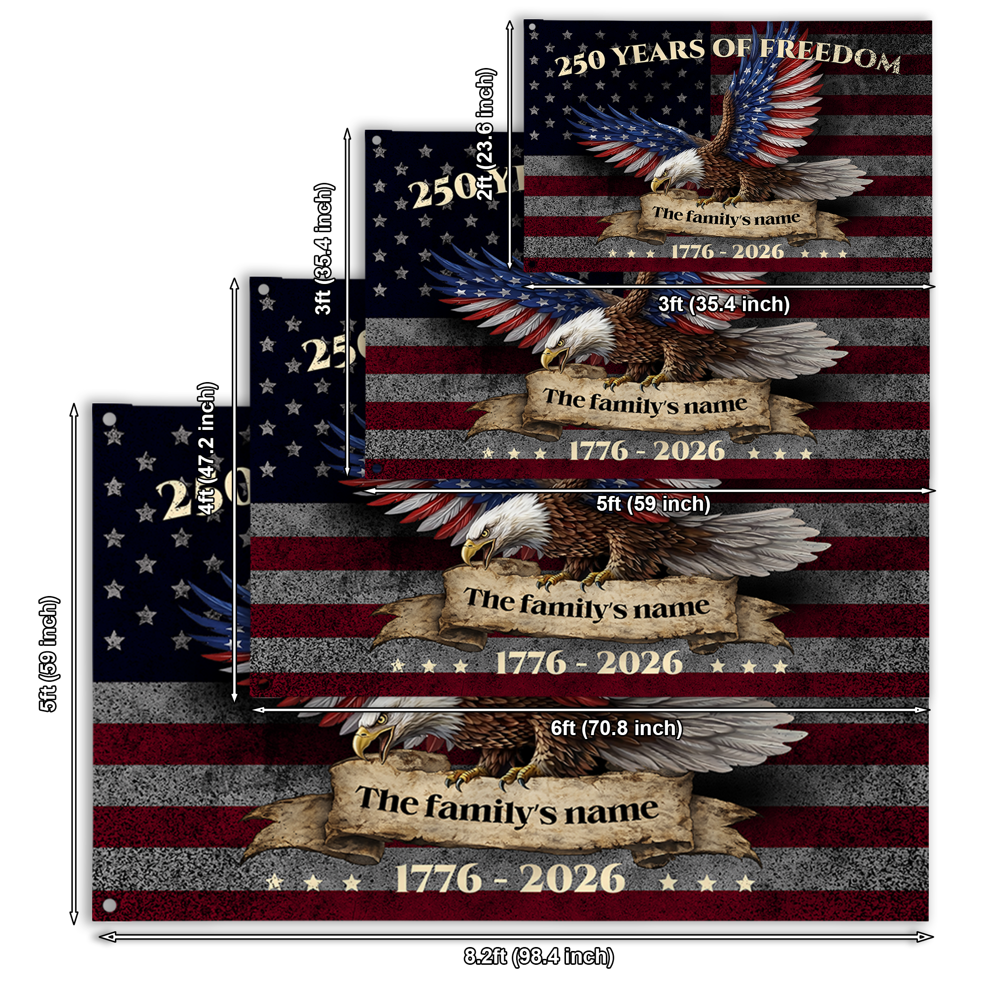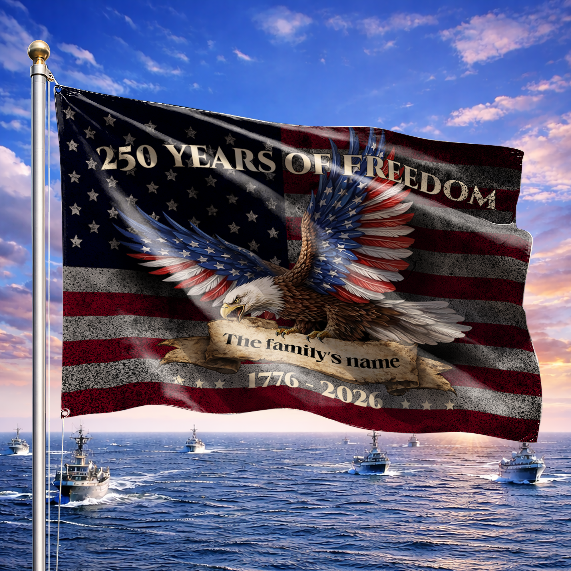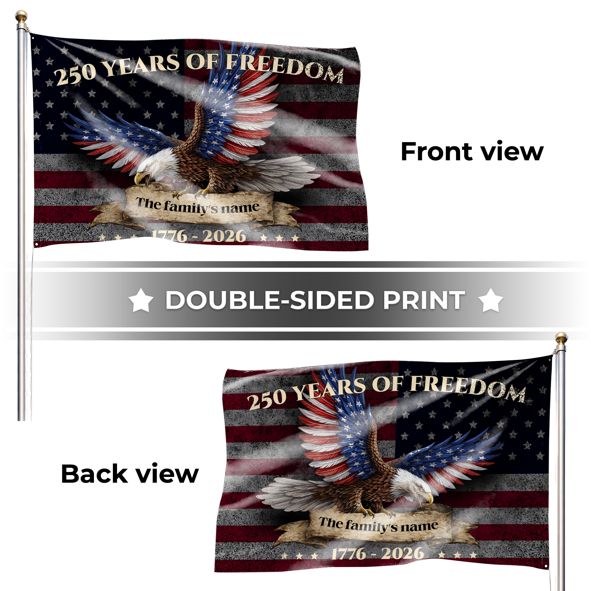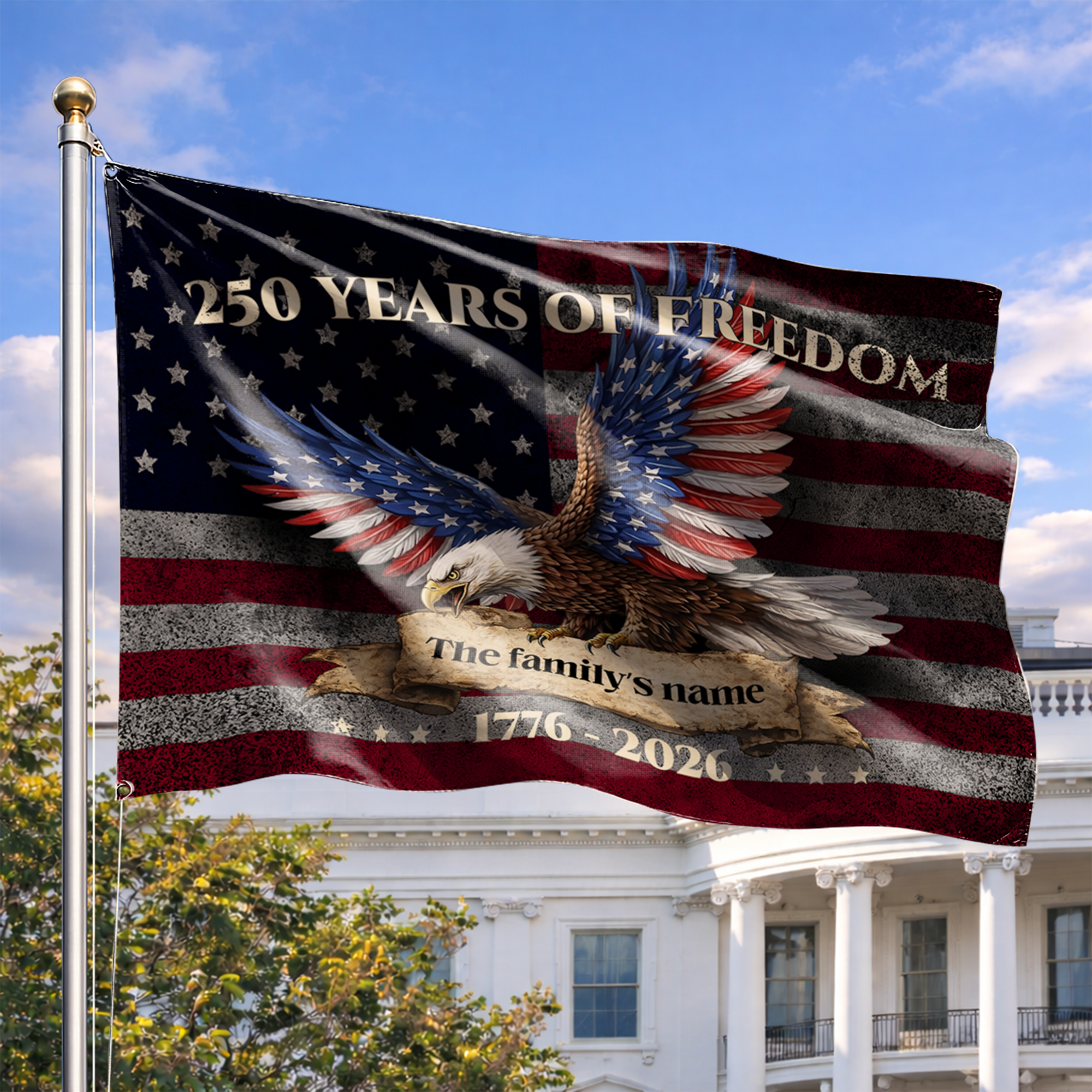 Leave a lasting legacy of patriotism. Customize your "250 Years of Freedom" eagle flag with your family name today and let your American spirit soar!