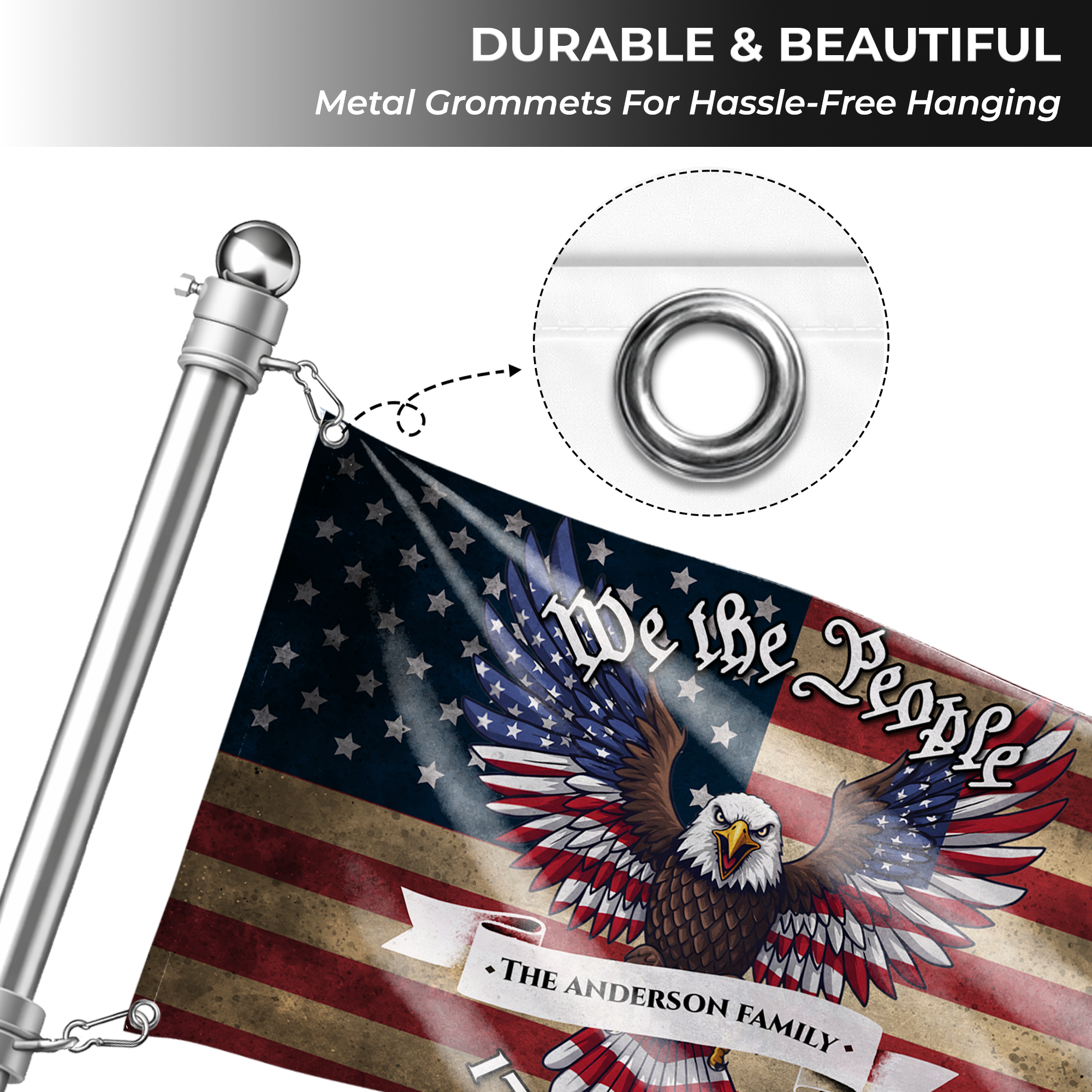 Celebrate your American pride and family heritage with our personalized "We The People" patriotic flag. Featuring a majestic bald eagle soaring across a vintage star-spangled banner, this stunning design captures the true essence of liberty, freedom, and the enduring values of the USA constitution.