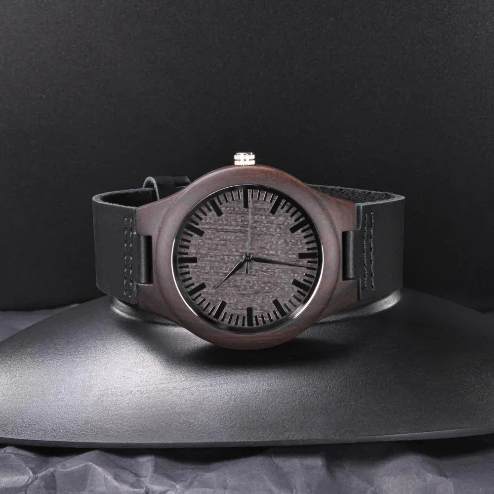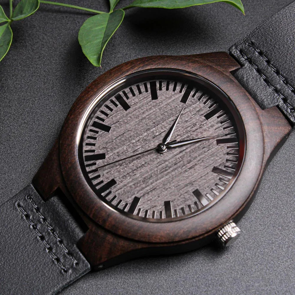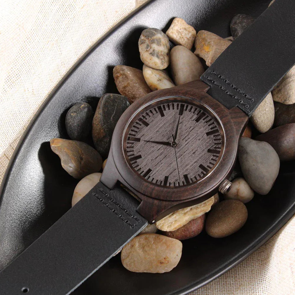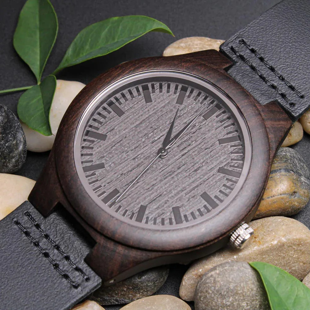 Looking for a gift as bold and timeless as your special guy? The Engraved Wooden Watch is a versatile accessory that's perfect for stylish, everyday wear. Encased in rich sandalwood and paired with a genuine leather strap, this piece is as impressive as the man who wears it. So whether it's a thoughtful birthday gift, an anniversary memento, or a long-lasting keepsake for Father's Day - be sure to get him the gift that will warm his heart for years to come. Ships in a gift box - so it can be sent directly to your lucky recipient.